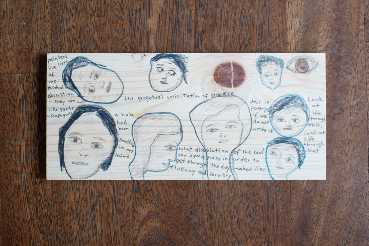 砂にまみれた不完全な言葉……私は洞窟へと巻き込まれ、果てしない回廊の中で紙のように羽ばたく……私は、同一性のない太陽なき領域をさまよってきた……私は毎日、掘り起こす——発掘する。千年前に女性たちが残した砂の中から、自分自身の遺物を見つける……煙の輪のように言葉が私のまわりに立ちのぼるのが見えないとき、私は闇の中にいる——私は無である……ページはしばしば泥に汚れ、破れ、色あせた葉や、バーベナやゼラニウムの切れ端で貼り合わされている。この詩を読むには無数の眼が必要だ……私は人生の痕跡を、外ではなく内側に受け取った……私は、名もなきほど繊細でありながら匂い、色、質感、実体をもつ心や顔や事物の刻印によって、曇り、傷ついている……人生は不完全であり、未完のフレーズだった……私たちは他者の顔に刻まれた象形文字を解読する。